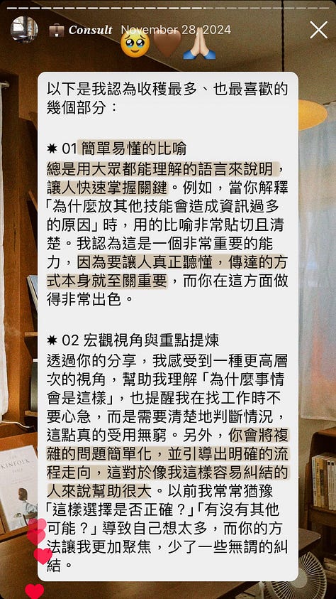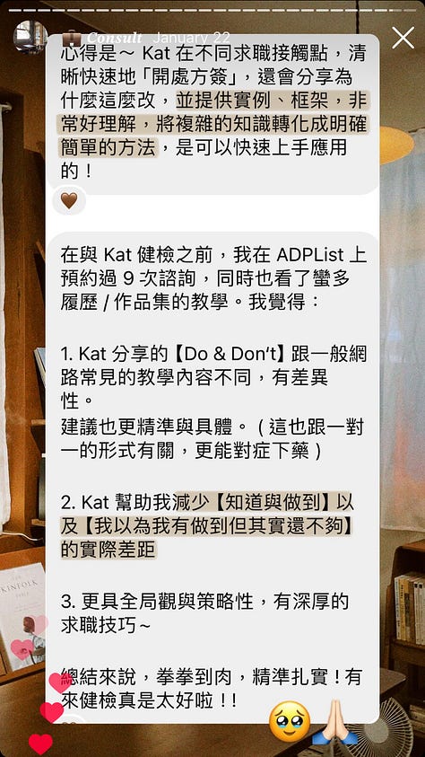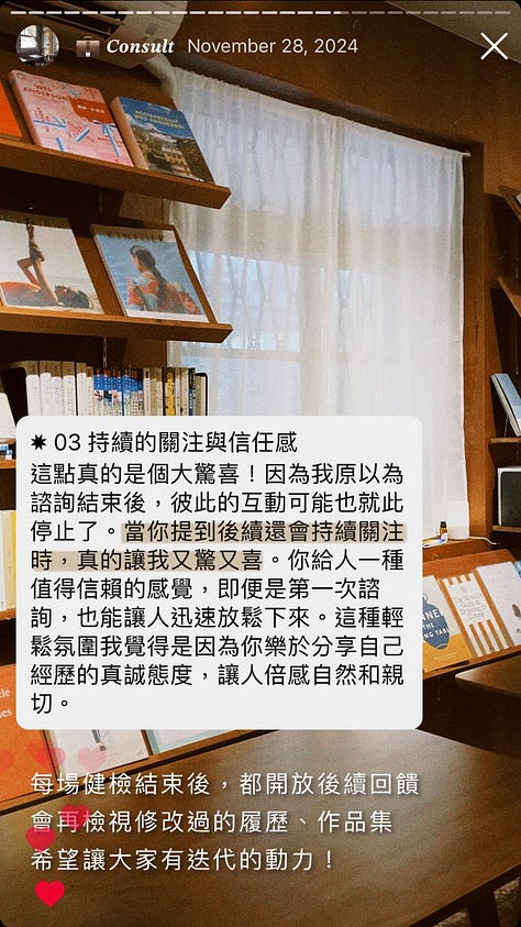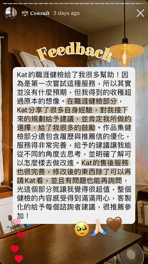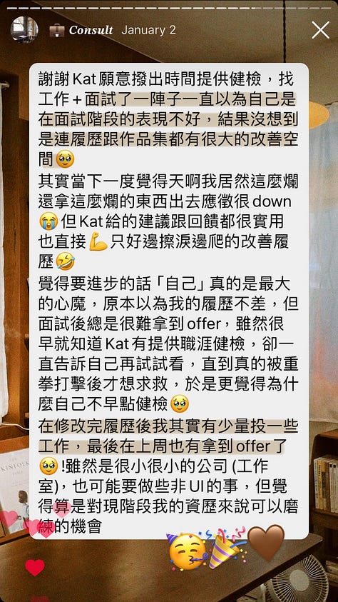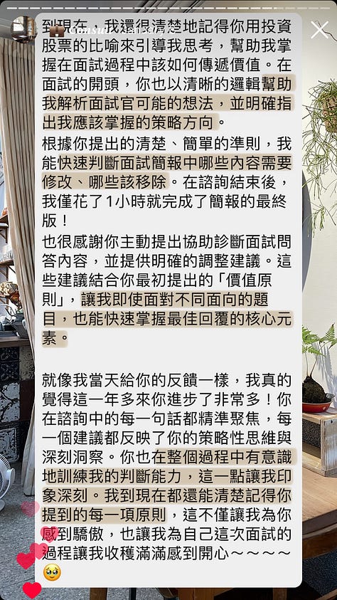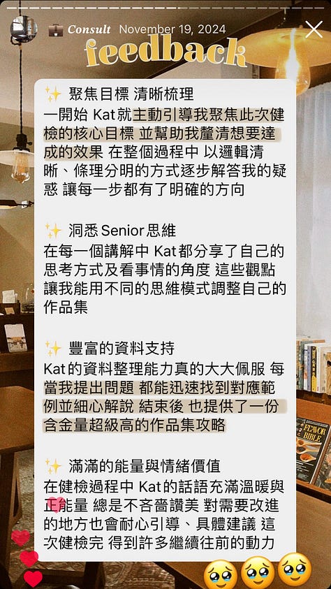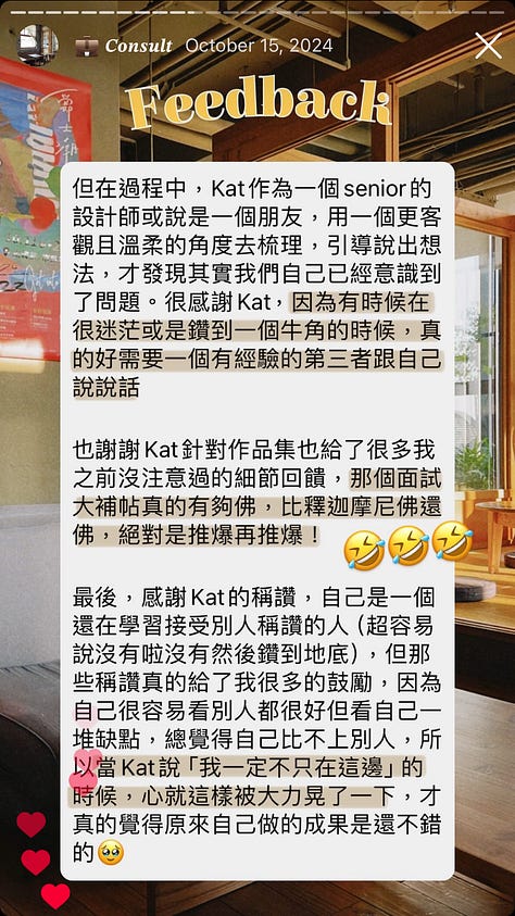 在不同階段的求職過程中,我觀察到隨著 UI/UX 設計領域和 AI 技術的發展成熟,求職市場也越來越競爭,設計師在面試的每個接觸點上都更需要策略性思考。這也是為什麼我希望能透過職涯諮詢服務,減少設計師求職時的阻礙。