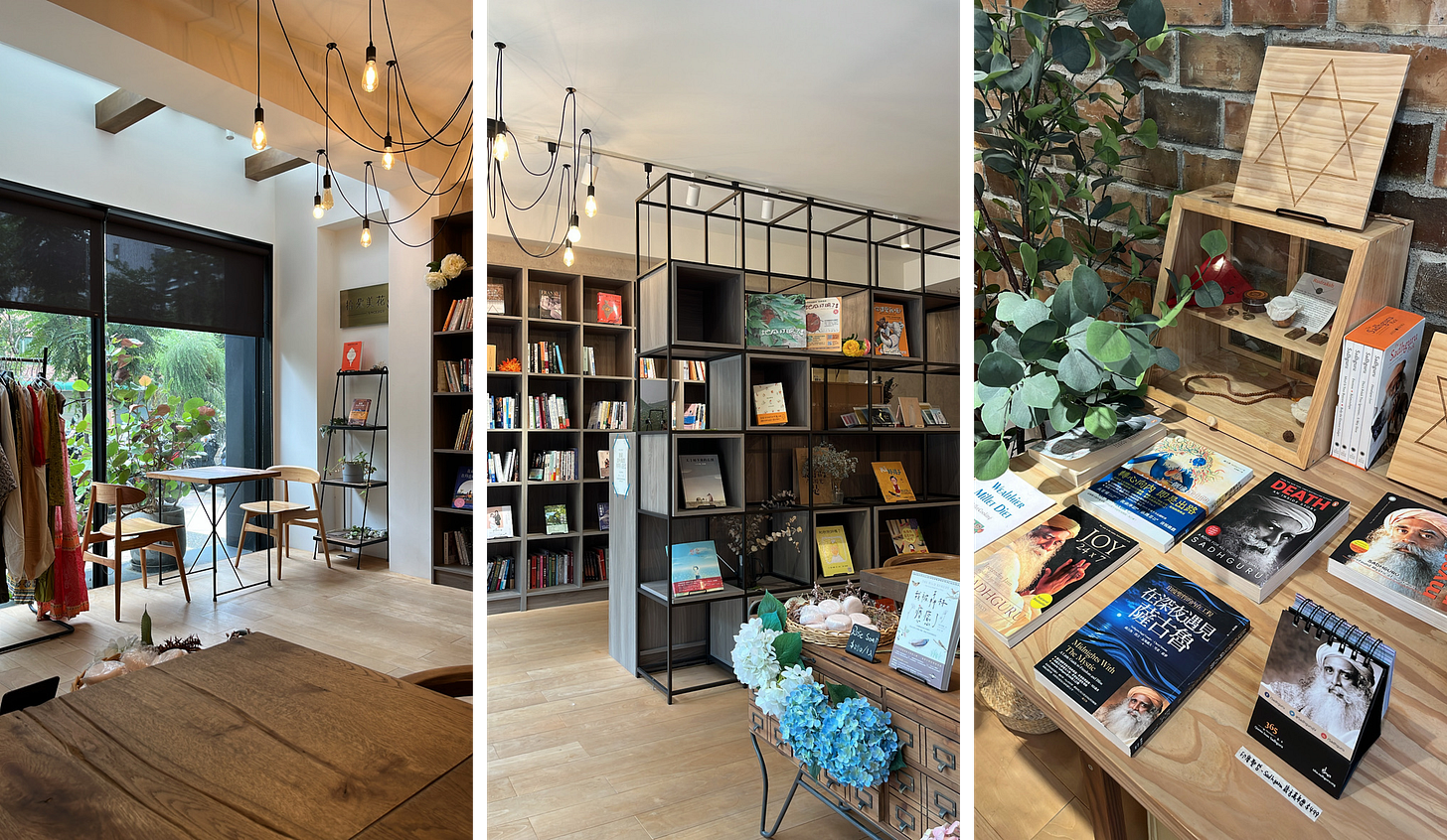 一走進去甘納許小書院,就感覺心變得開闊,空間相當寬敞明亮,右側還有難得一見的「薩古魯書區」,書店平時也會舉辦不少跟放鬆療癒相關的活動。