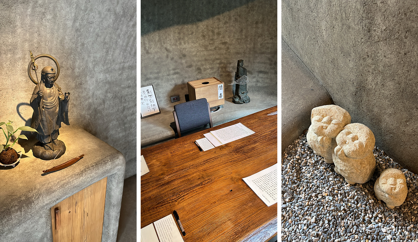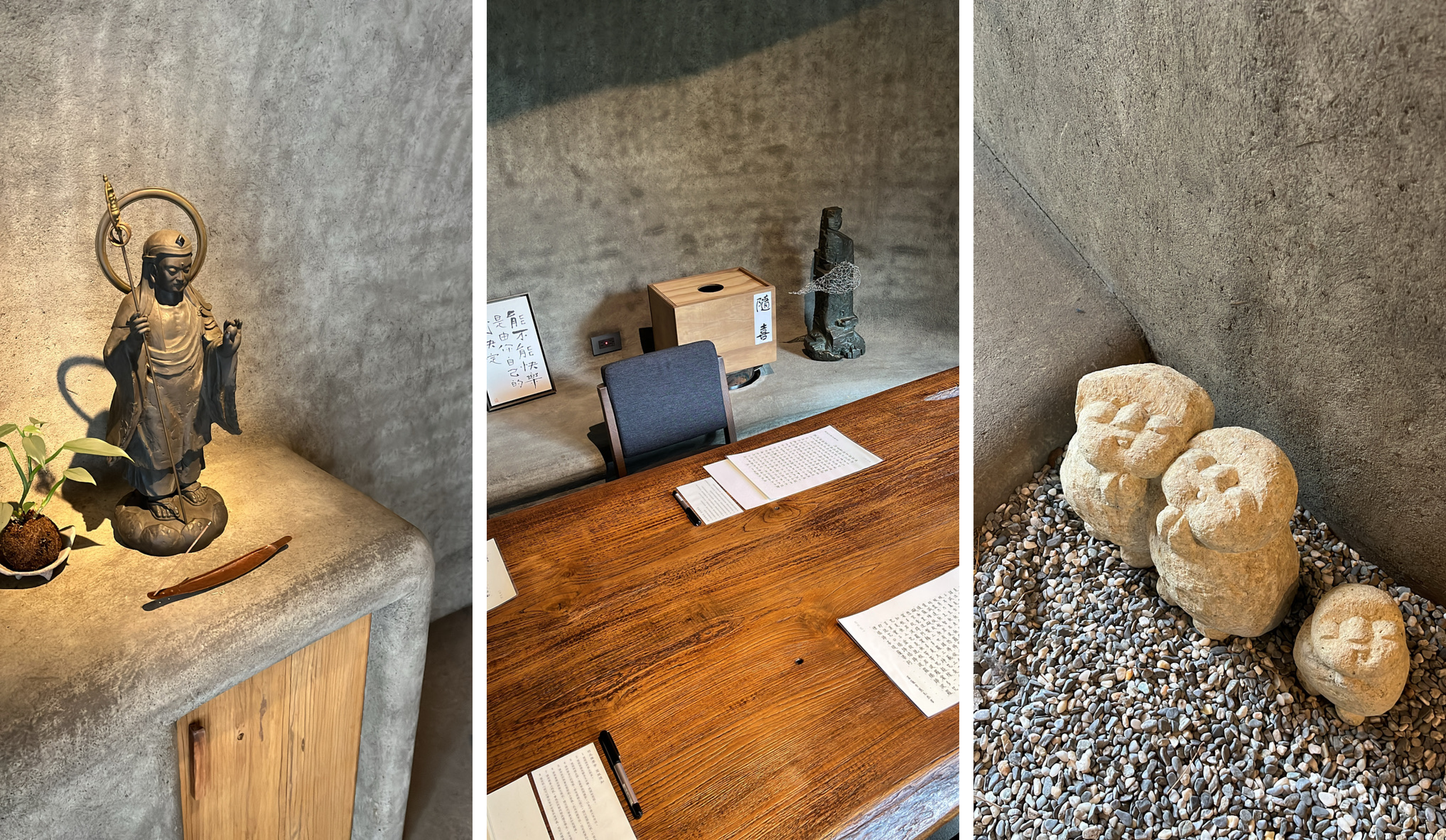 對了,你也會在多個角落見到松崎勝美雕刻的小佛石雕(下圖最右側),每次看向他們都會不自覺微笑,他們的表情好柔和,好像能接納一切。