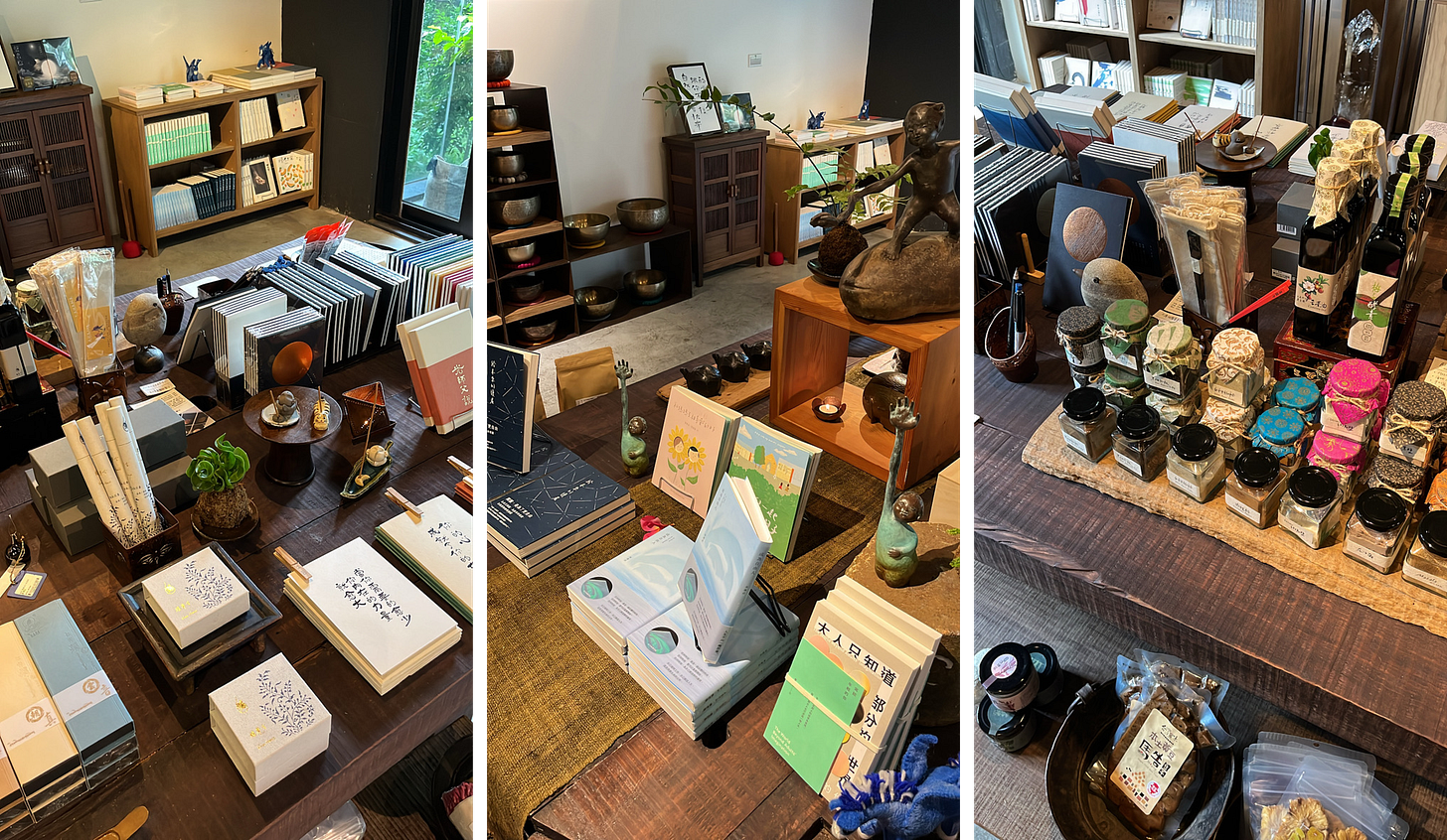 這裡除了維摩舍出版的所有書本(包含獨角獸計劃創辦人李惠貞老師的作品),也有選物(布衣、明信片、羊毛氈吊飾等)。身處在維摩舍的當下,我感覺是時候可以來讀《光師父說心經》了,目前先購買了前兩冊。